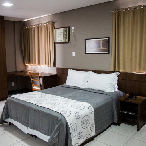 Os apartamentos oferecem uma estrutura acolhedora, com área de estar, TV com canais abertos, frigobar, mesa de trabalho, ar-condicionado e decoração moderna.